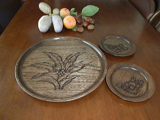 | 2作目のお盆と3作目の皿がやっとできあがりました。 梅雨前に彫り上がっていたのですが、塗装に手間取ってしまいました。 梅雨と猛暑はお休み。秋晴れになって上塗りを終えました。 庭で採れたアケビ、柿、栗などを盛ろうと思います。 |
