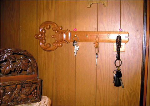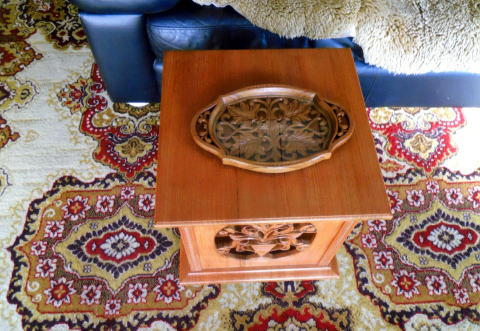 | 居間の片隅に装飾する彫物。 チーク材の色彩が内壁に溶け込むかのようにマッチング。 お気に入りです。 また、鍵置き忘れ防止にも役立っています。 |